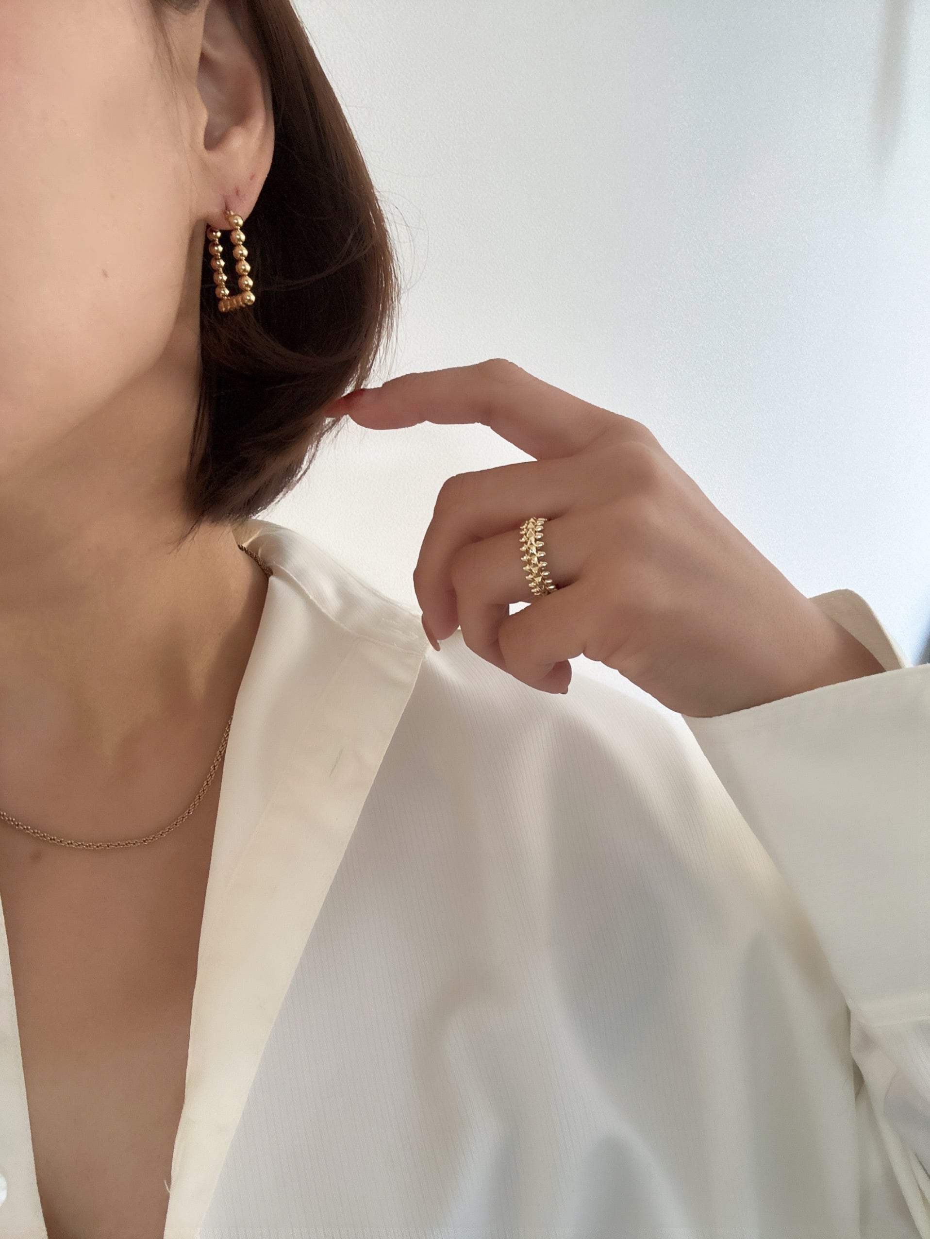 グレインテクスチャーが耳元に独自の魅力を加え、シンプルでありながらも存在感を放ちます。このピアスは、カジュアルなスタイルから特別な日のおしゃれまで、さまざまなシーンで活躍するアイテムです。