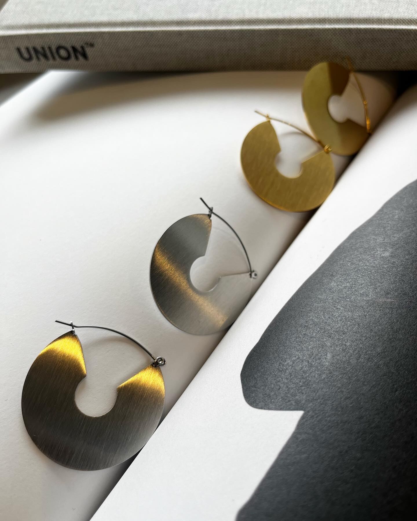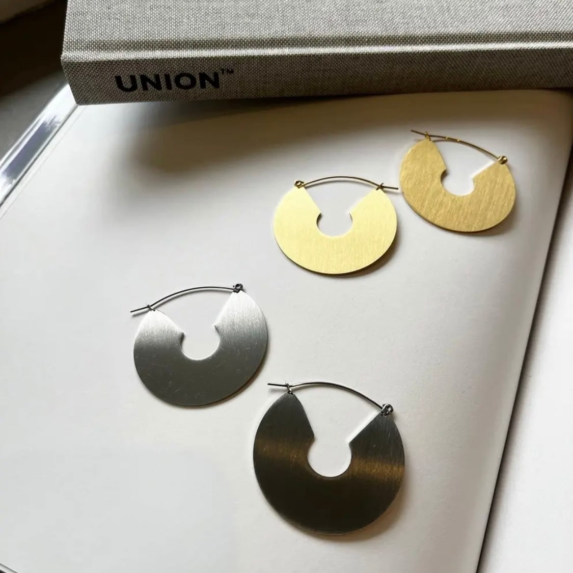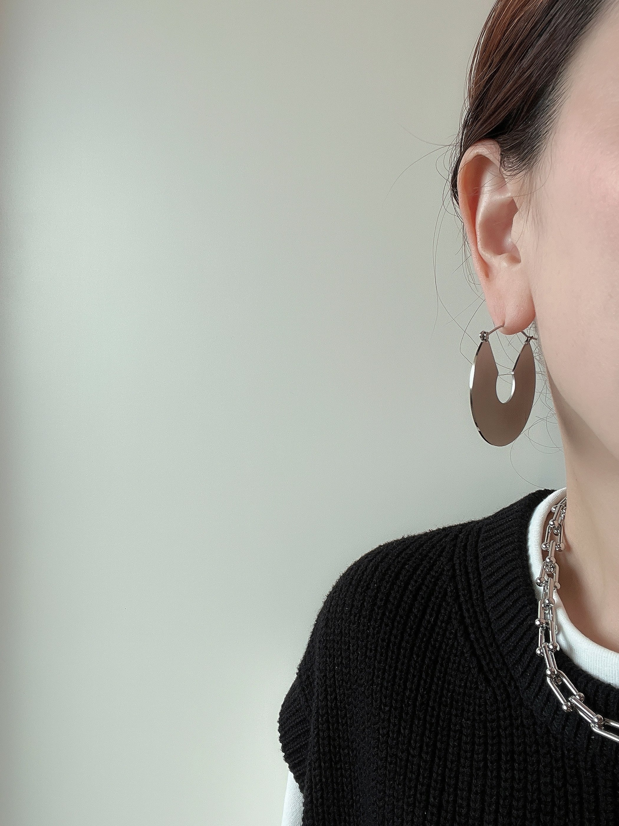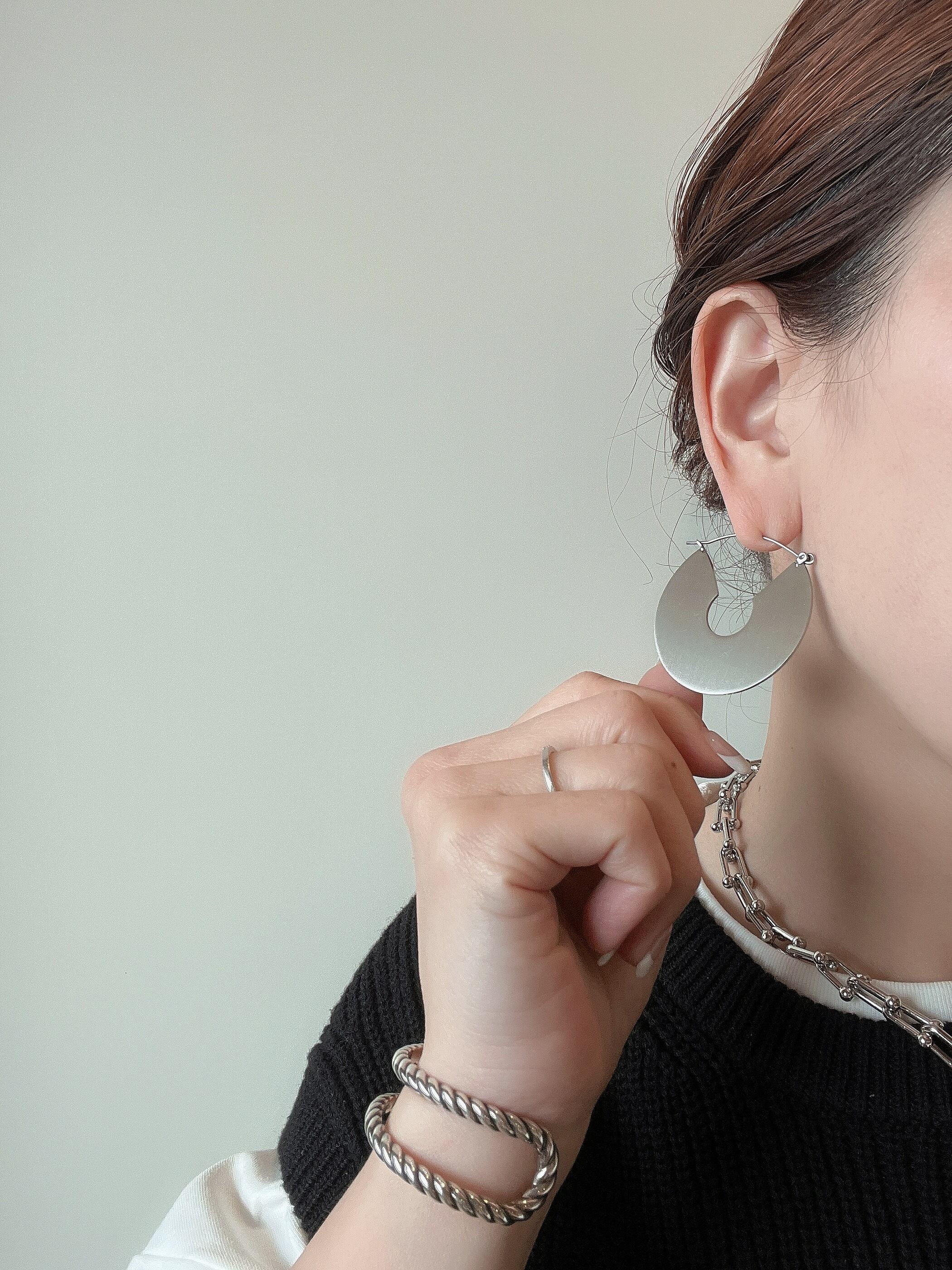 シンプルなサークルフォルムと、滑らかなマット素材のプレートピアス