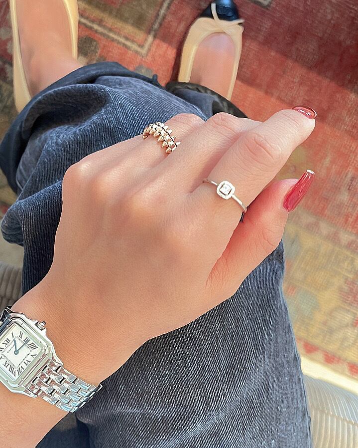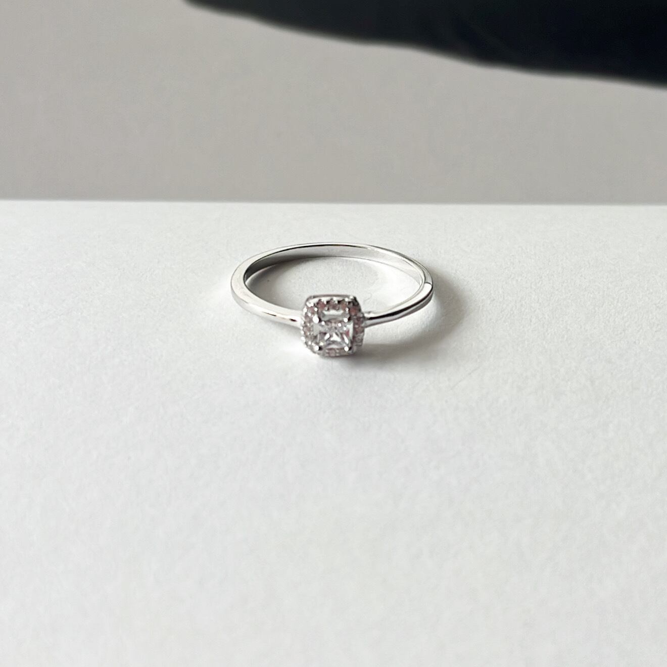 スクエアのジルコニアを小粒のジルコニアで囲んだデザインはシンプルながら、立体感があり華やかなリング◽︎